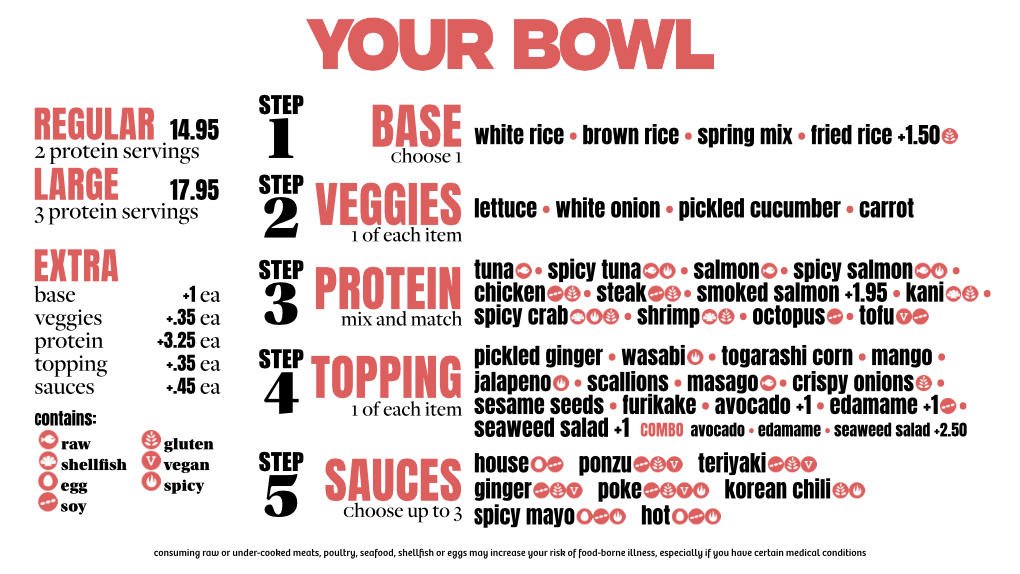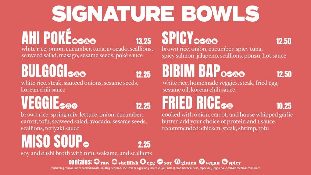 White rice, lettuce, onion, cucumber, carrot, tuna, salmon, escolar, seaweed salad, scallions, masago, furikake, sesame seeds, radish sprouts, ponzu sauce and korean chili sauce. The BiBim Bap and Poke collab you’ve been waiting for.